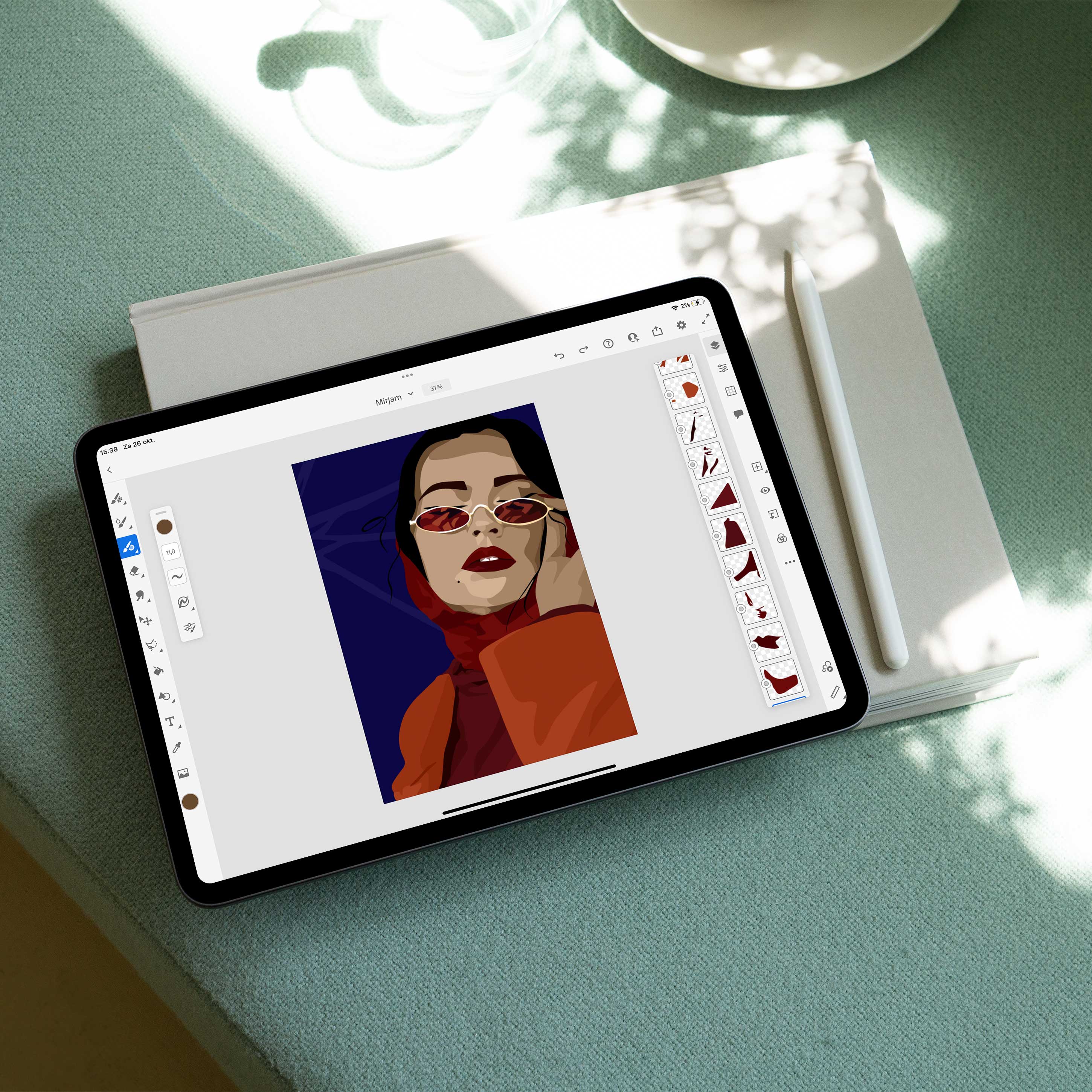 Mijn creatieve proces begint met schetsen, zowel op papier als op mijn iPad. Hierna werk ik de vormen en schaduwen verder uit in kleurvlakken, wat doet denken aan het effect van een zeefdruk. Zodra de lijnen vaststaan, besteed ik veel aandacht aan de kleuren. Hoewel ik vaak al een idee heb van mijn kleurenpalet, zorg ik ervoor dat alles mooi harmonieert en dat de kleuren samen een krachtig geheel vormen.